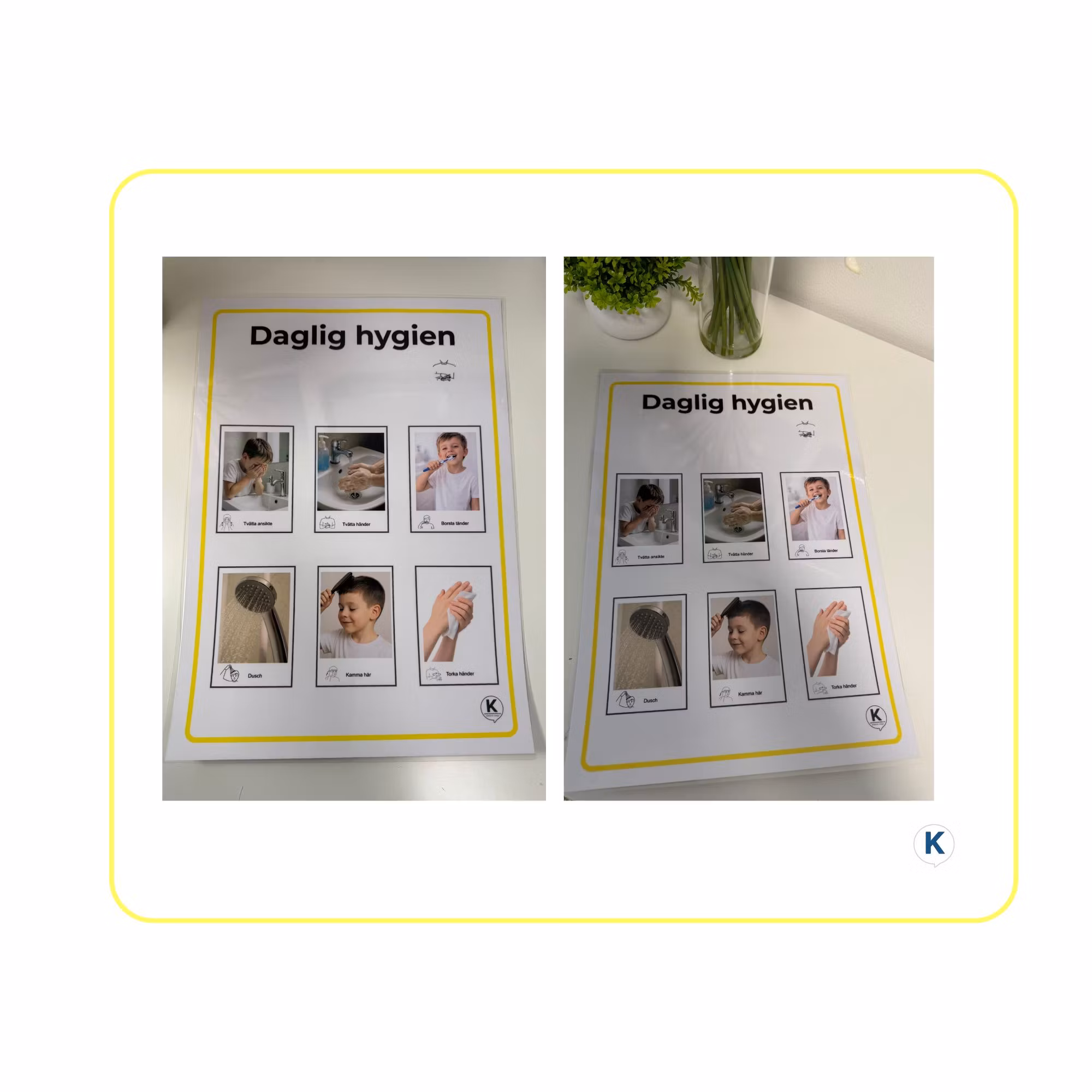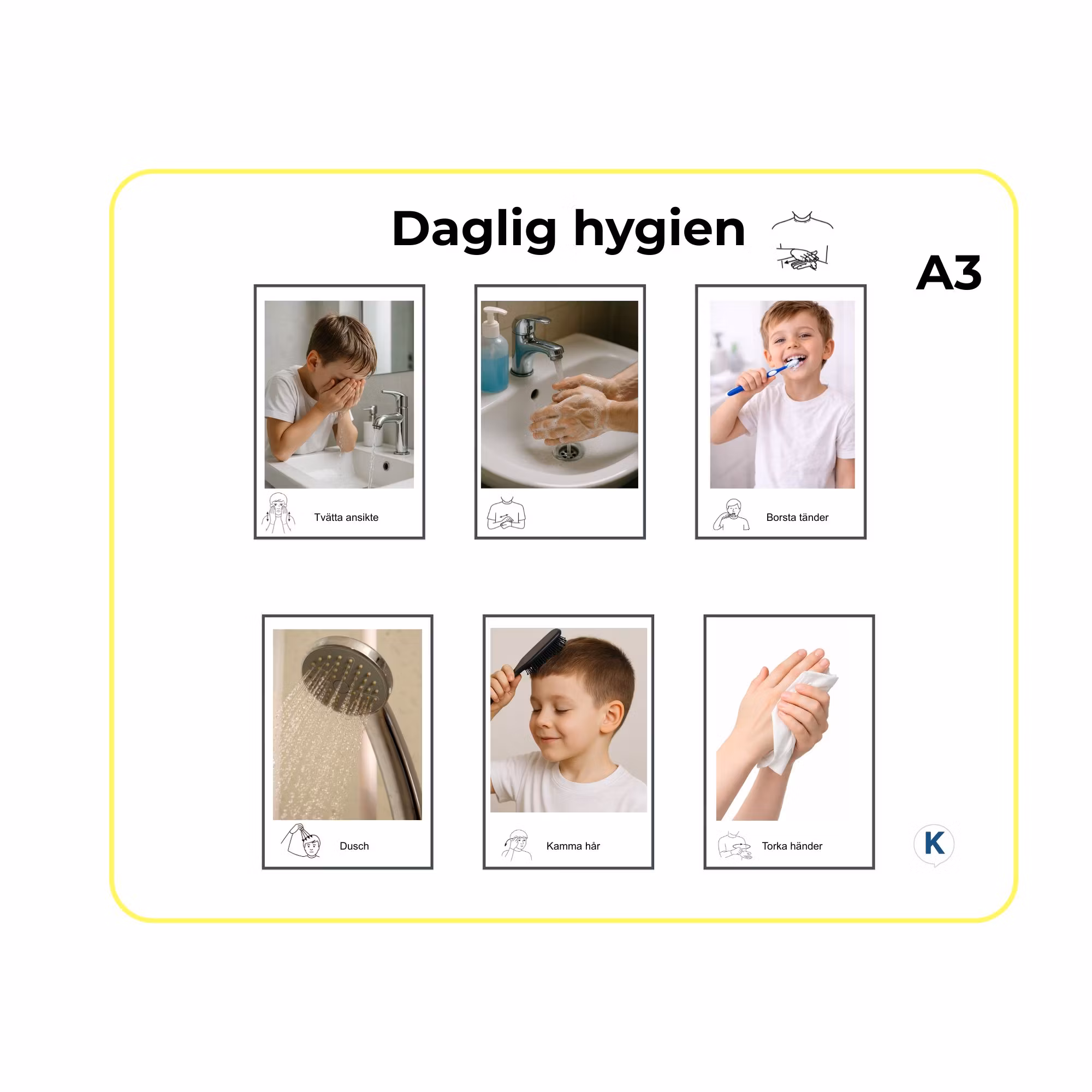 Daglig hygien – Bildstöd affisch A3Bildstöd som skapar struktur och tydlighet i dagliga hygienrutiner.Affischen visar tydliga moment som hjälper barnet att förs