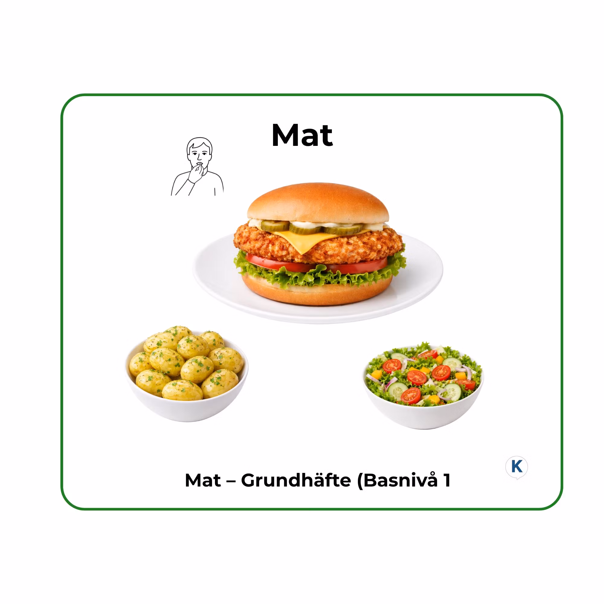 Mat – Grundhäfte (Basnivå 1) är ett enkelt och tydligt bildstöd som fokuserar på de viktigaste momenten kring mat och måltider.