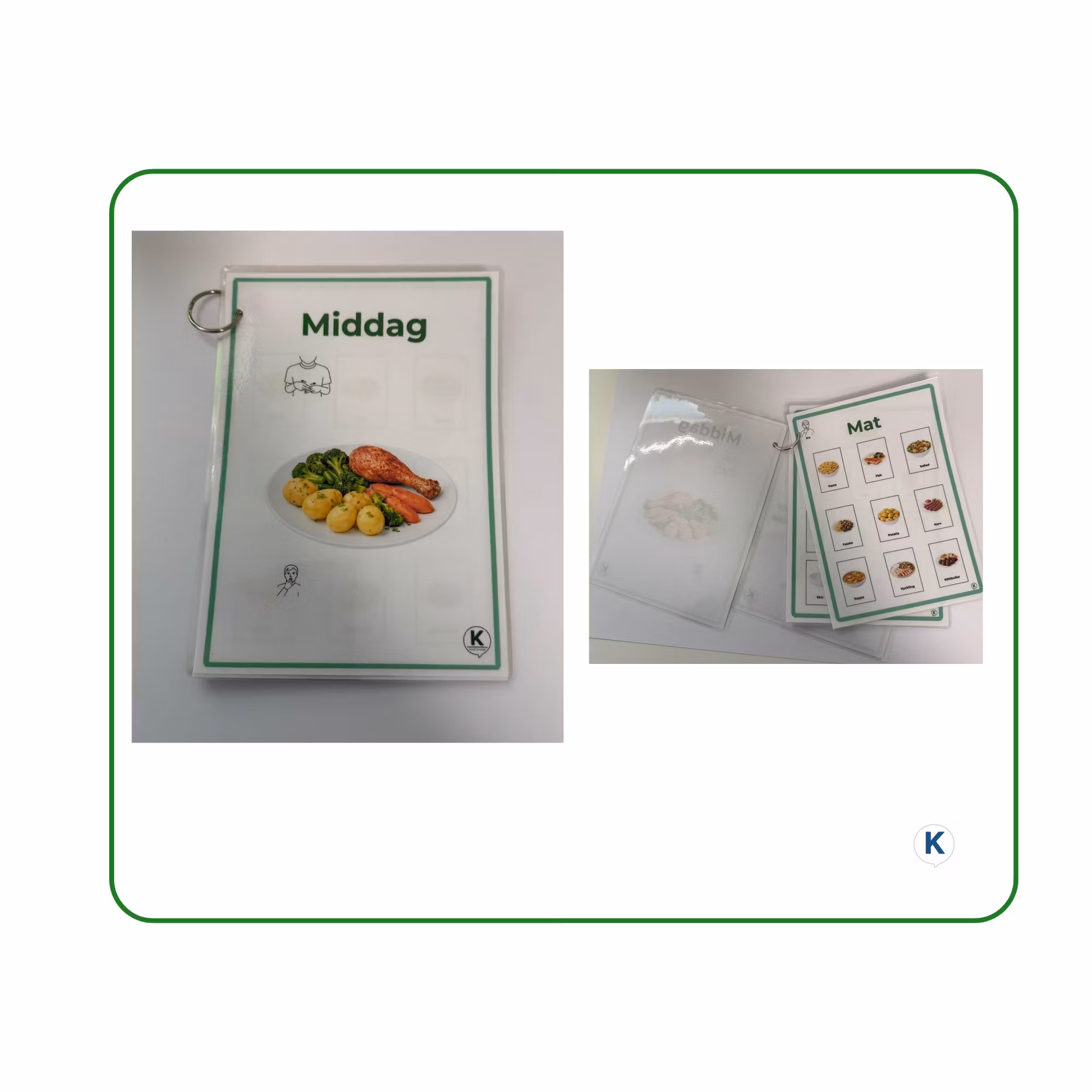 Ett laminerat A5-häfte som ger tydligt bildstöd kring middag och måltidssituationen. Innehåller bilder för äta, dricka och vanliga maträtter som köttbullar, kyckling, fisk, pasta, korv, fisk samt vegetariskt alternativ.