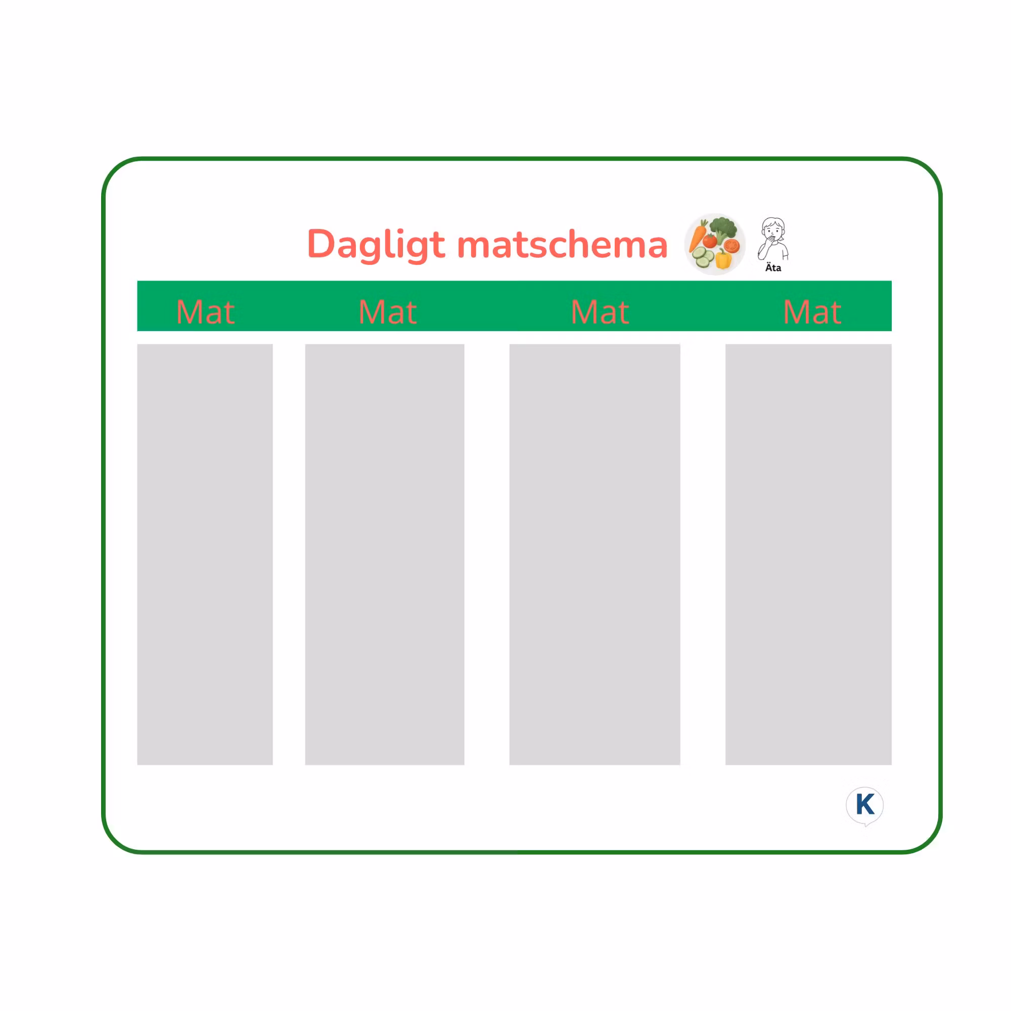 Ett laminerat, avtorkningsbart matschema som ger tydlig överblick över dagens måltider. Schemat gör det möjligt att följa vad som har ätits tidigare och planera dagens intag utifrån barnets behov.