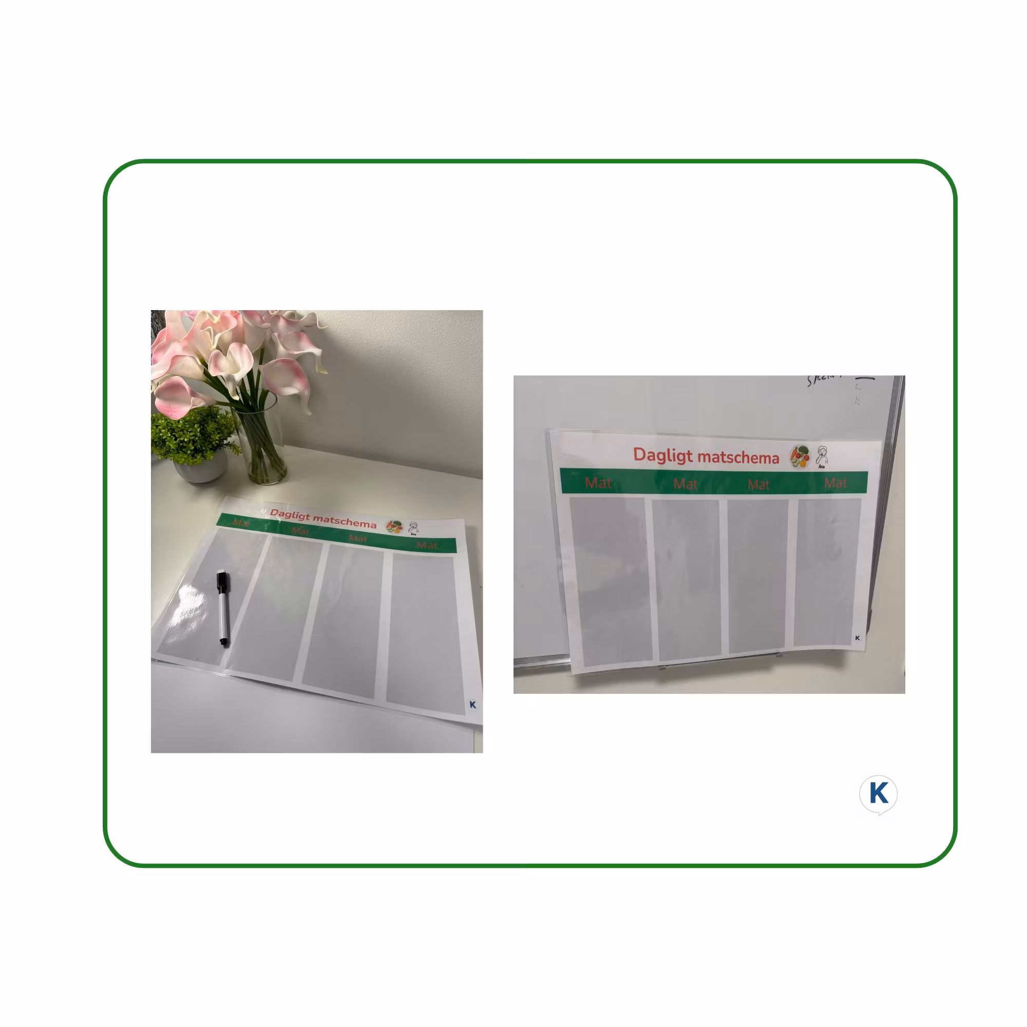 Dagligt matschema – Lunch (A3)Ett laminerat, avtorkningsbart matschema som ger tydlig överblick över dagens måltider. Schemat gör det möjligt att följa vad som