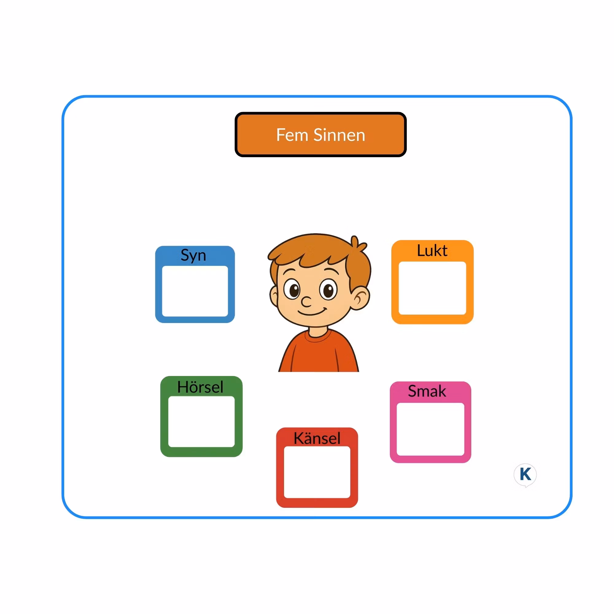 En tydlig och pedagogisk affisch som hjälper barn att förstå de fem sinnena: syn, hörsel, känsel, smak och lukt.