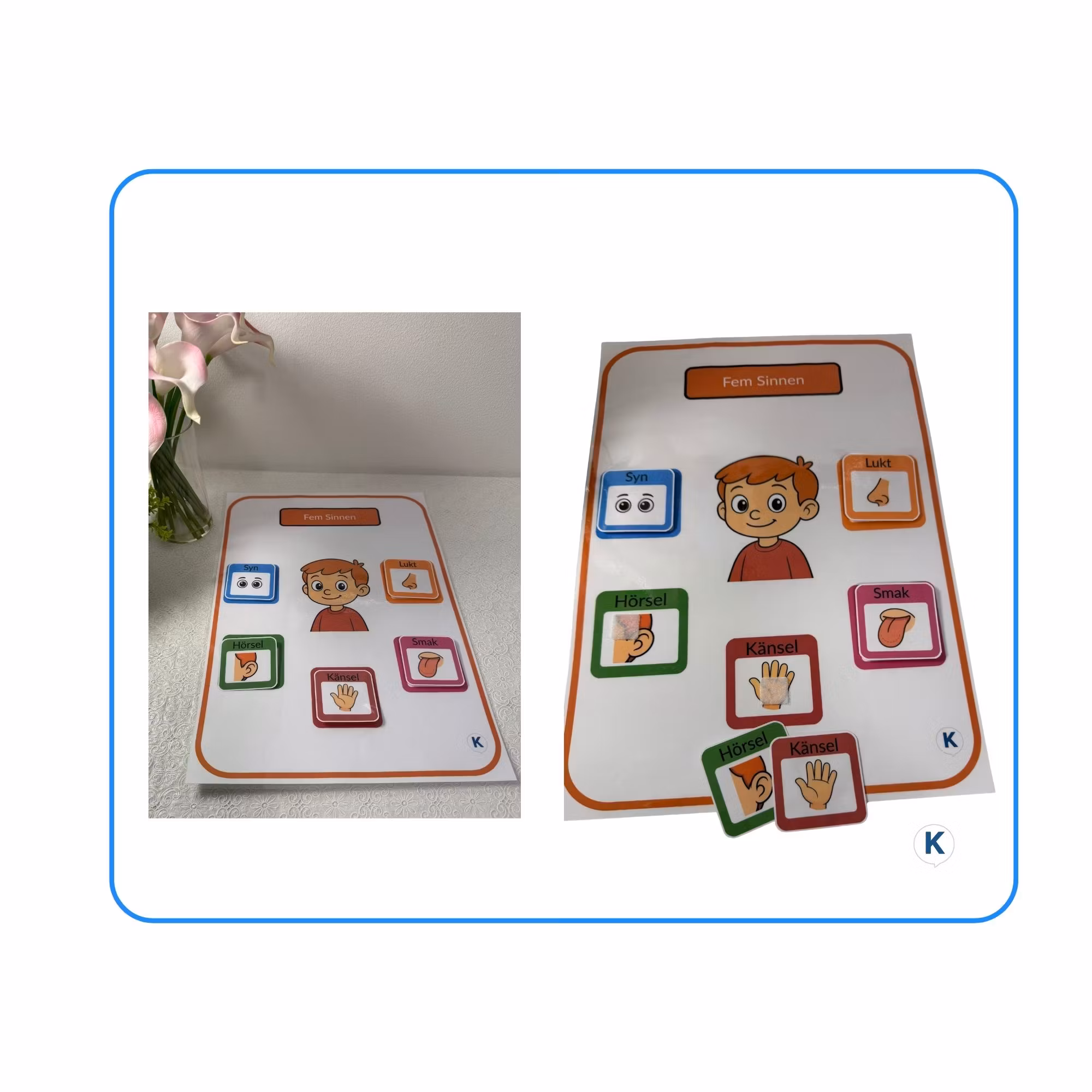 Fem sinnen – Interaktiv A3 affischEn tydlig och pedagogisk affisch som hjälper barn att förstå de fem sinnena: syn, hörsel, känsel, smak och lukt.Affischen inne